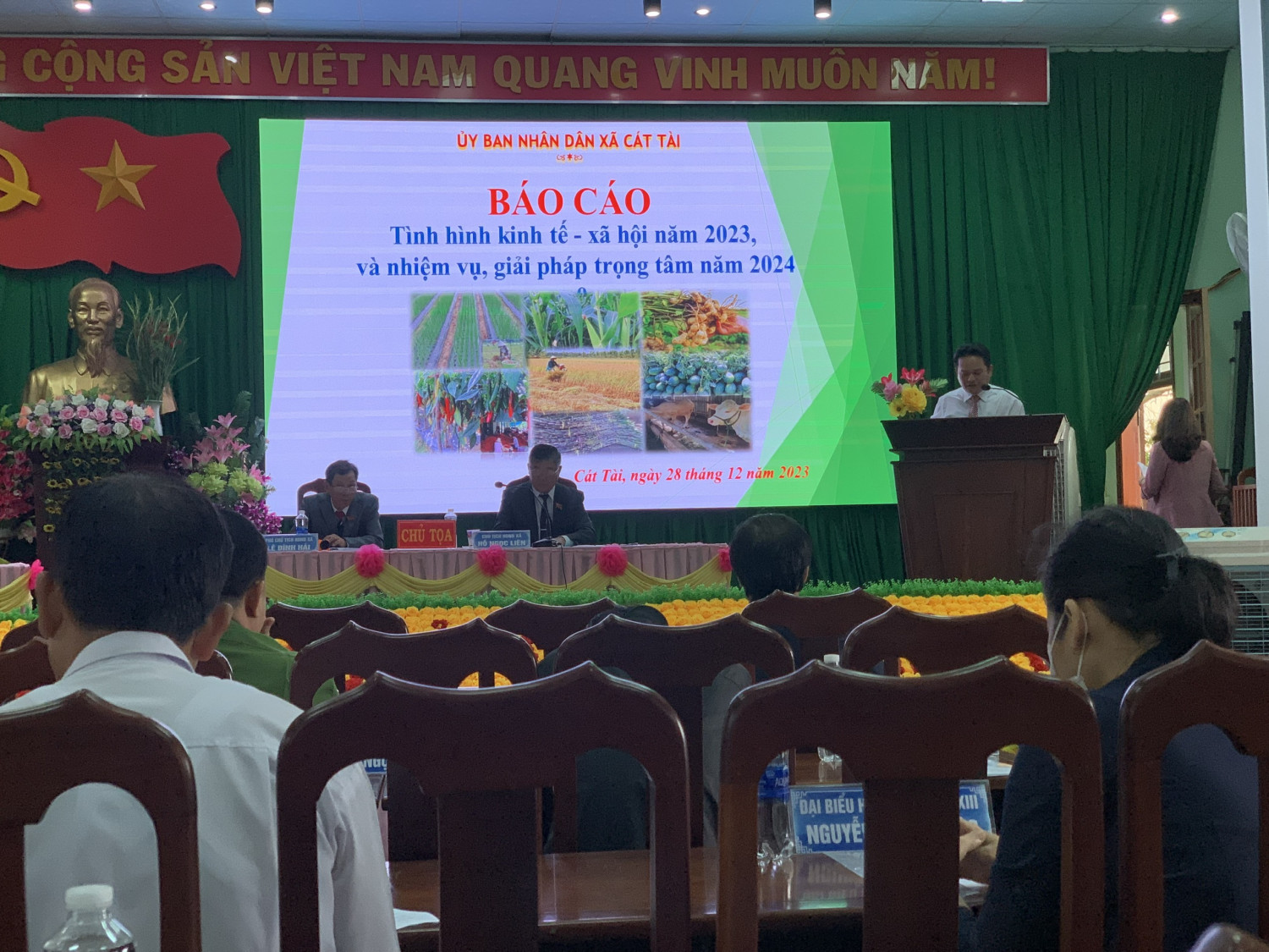 Đại biểu HĐND xã thảo luận, quyết định một số chỉ tiêu kế hoạch và nghe báo cáo của thường trực UBMTTQVN xã tham gia xây dựng chính quyền và ý kiến, kiến nghị của Mặt trận và các tổ chức thành viên tại kỳ họp lần thứ 7 HĐND xã khóa XIII, nhiệm kỳ 2021-2026; Báo cáo kết quả lấy phiếu cho thôi làm nhiệm vụ đại biểu HĐND xã Cát Tài nhiệm kỳ 2021-2026.