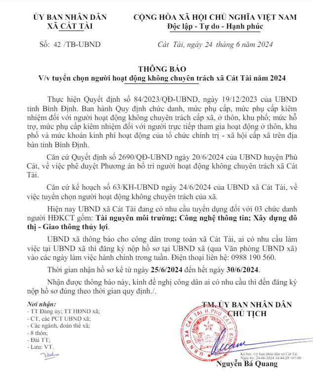 Khuyến học, Khuyến tài, Thông báoThông báo V/v tuyển chọn người hoạt động không chuyên trách xã Cát Tài năm 2024 Posted on 24/06/2024 by QuanLy Chia sẻ: